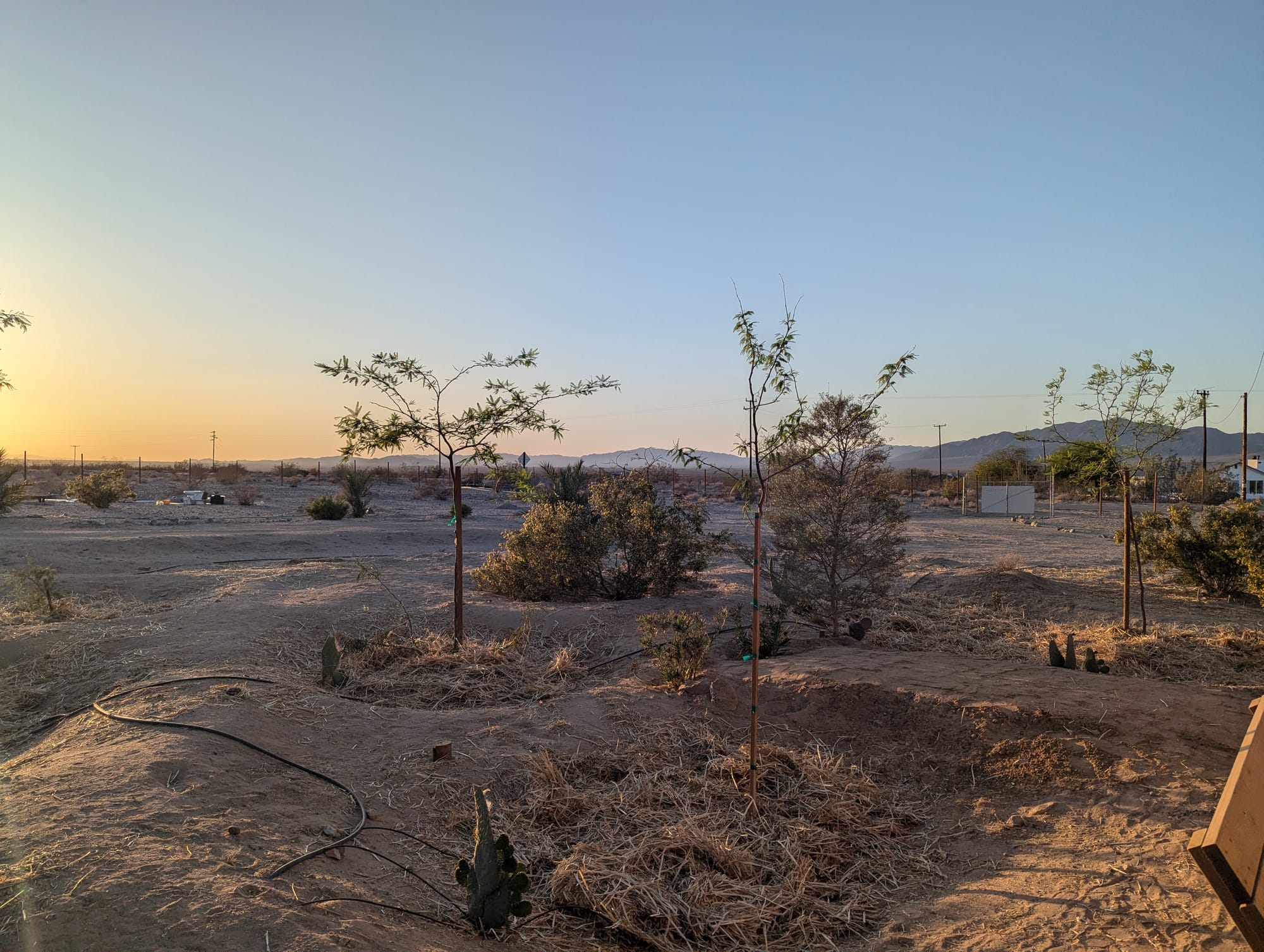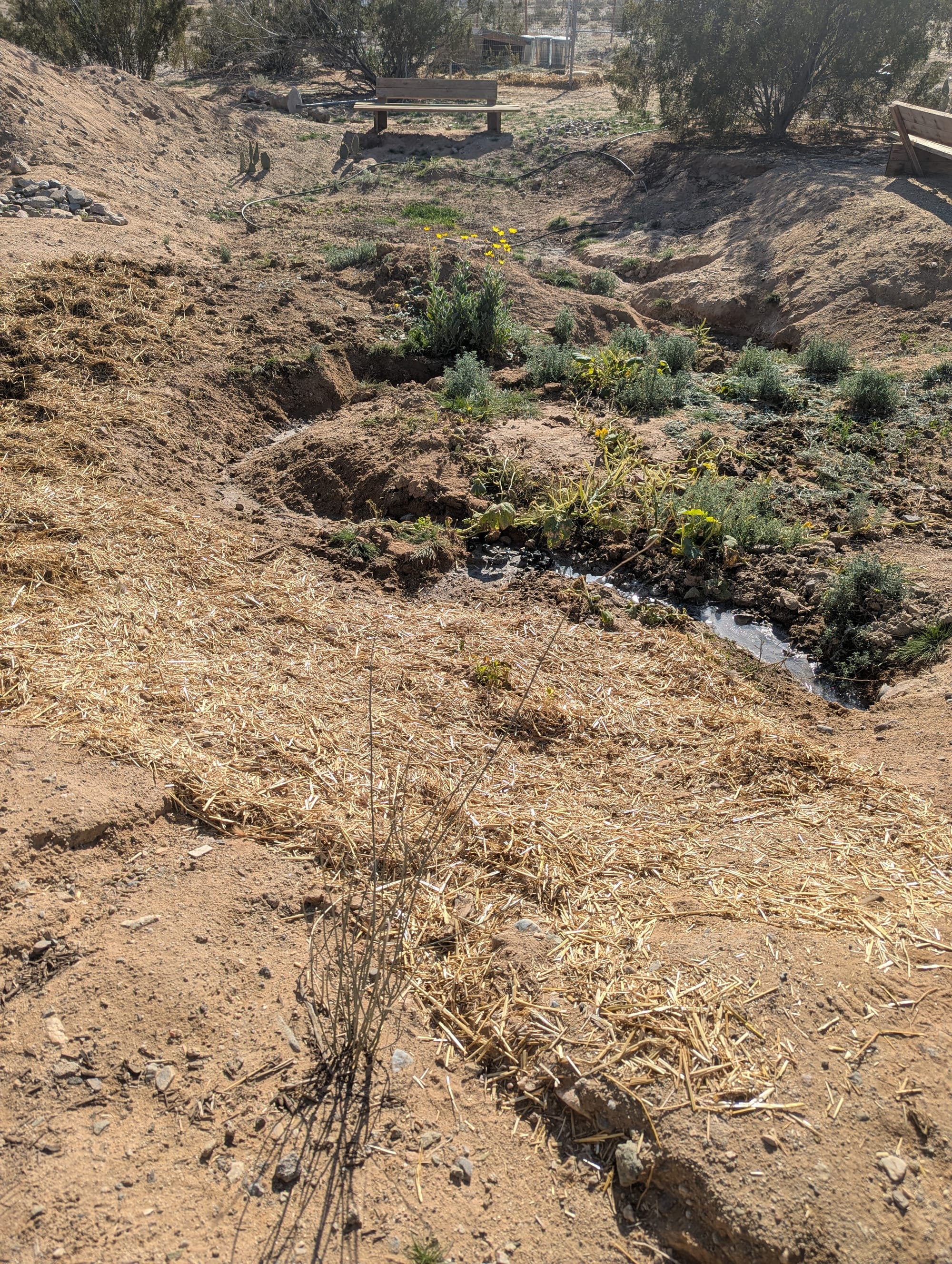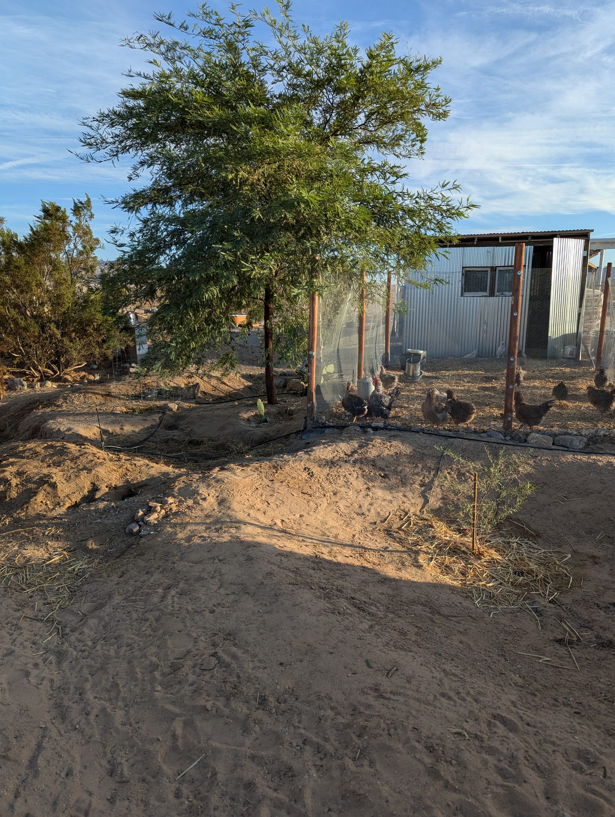 Thinning greens from garden beds in late February 2026, this little boquet of baby greens is salad-ready (after a little rinse)Sunchoke babe February 2026Blooming flax by baby honey mesquite in our new East garden February 2026Heavy rains back in October 2023, photos taken to track water movement and plan earthworksBack in 2023 we took organic waste from local festival Bhakti Fest to aid in sustainable waste management for our community. Here is Starlight pulling trash from unscrupulous festival goers out of the compost material. Blooms in front of the house Fall 2025Greywater basin evolution as of January 2026 with more mature volunteer plants and a deeper channel to permit upward water filtration. A charcoal biofilter has been added before the dropoff with filter plants being grown. Pigs that we also brought home from the homestead that needed to get rid of its stock. They also seem quite pleased with larger, cleaner living quarters (and lots more food!)Turkeys we brought home from a failing homestead. They were in very neglectful conditions but are recovering and seem much more relaxed - they will be food for our working dog in the Spring. One yearling "mama" and her three toms, there is also a young female not pictured. Baby squash on the vine with their blossomsUpdated greywater basin with meandering channels as of December 2025. Winter wheat is sprouting at the far end, and the closer side is getting very green!More and more raptors are returning. This is a coopers hawk scouting the chicken run (he can't get in, don't worry, but that doesn't stop him from taking a peek every now and then). Newly completed (as of November 2025) earthworks amongst in-progress earthworks in our front herb and vegetable garden. We just transplanted this 9 month old Chilean mesquite so it could have a drier home, and the palo verdes behind it have been there for about a year now.Desert milkweed in front of a greywater basin with meandering channels in progress, full of flourishing native and non-native annuals like desert sunflower, cinchweed, spaghetti squash (for future pigs), ricegrass, and others. Some seeds were planted, some washed in during heavy rains and are wild natives. Mixed cover crop, medicinal, and vegetable basinOso protecting his flock this SummerHard to tell in the light, but this egg is purple, courtesy of one of our beloved hensMushrooms fruiting after rain (unknown type)Cowpeas are the champions of the Fall season so farCaesar and Nero (rear) the roosters, all grown upMultiple types of scarab beetles have returnedFlowering velvet mesquite with native bees (not honeybees!) and mothsCarving meandering channels for greywater management, yellow clover for soil cover and restorationSprouting squash in new soil we've built up using some unconventional methodsBlooming Texas Sage, a "non" sage with medicinal propertiesEarthworks in progress near the main house and a gorgeous two year old Chilean mesquite near the chicken runEarthworks in progress and new Chilean mesquite trees. Also shown: prickly pear cacti, an established acacia tree, and freshly planted jojoba in the back right.A tiger wing butterfly on blooming upright rosemaryEggs from our first flock of chickensA rare foggy dayBrooding Naked Neck chicks (about 2 weeks old) in a straw bale enclosure within the chicken coopOur first Chilean mesquite at 2.5 years oldOur first flock of chickens consisting of several different breeds, preparing to come off roost to eatLoyal guardian dog, Diego, taking a rest in the sunshineEmerging stars over the West fenceOur first potato cropLizards are returning to our landbaseA young cockerel (baby rooster)Place-sensible chickens with their long naked necks - this flock will thrive even through our hot summersViolet sage blooming in an infiltration basinStarlight & SiinWhite sage (forward) and screwbean mesquite (rear)Rhode Island Red chicks (our livestock cleanup team) at home in the eggmobileGolden hour in the baby West side forestGolden hour in the baby west side forestThe eggmobile, ready to be moved to livestock yards come FallProvider green beans sproutingBlack walnut and flowering green onions in a greywater basin - veggies in this basin are for genetic selection only (not eating), we'll save their seeds and replant elsewhere.