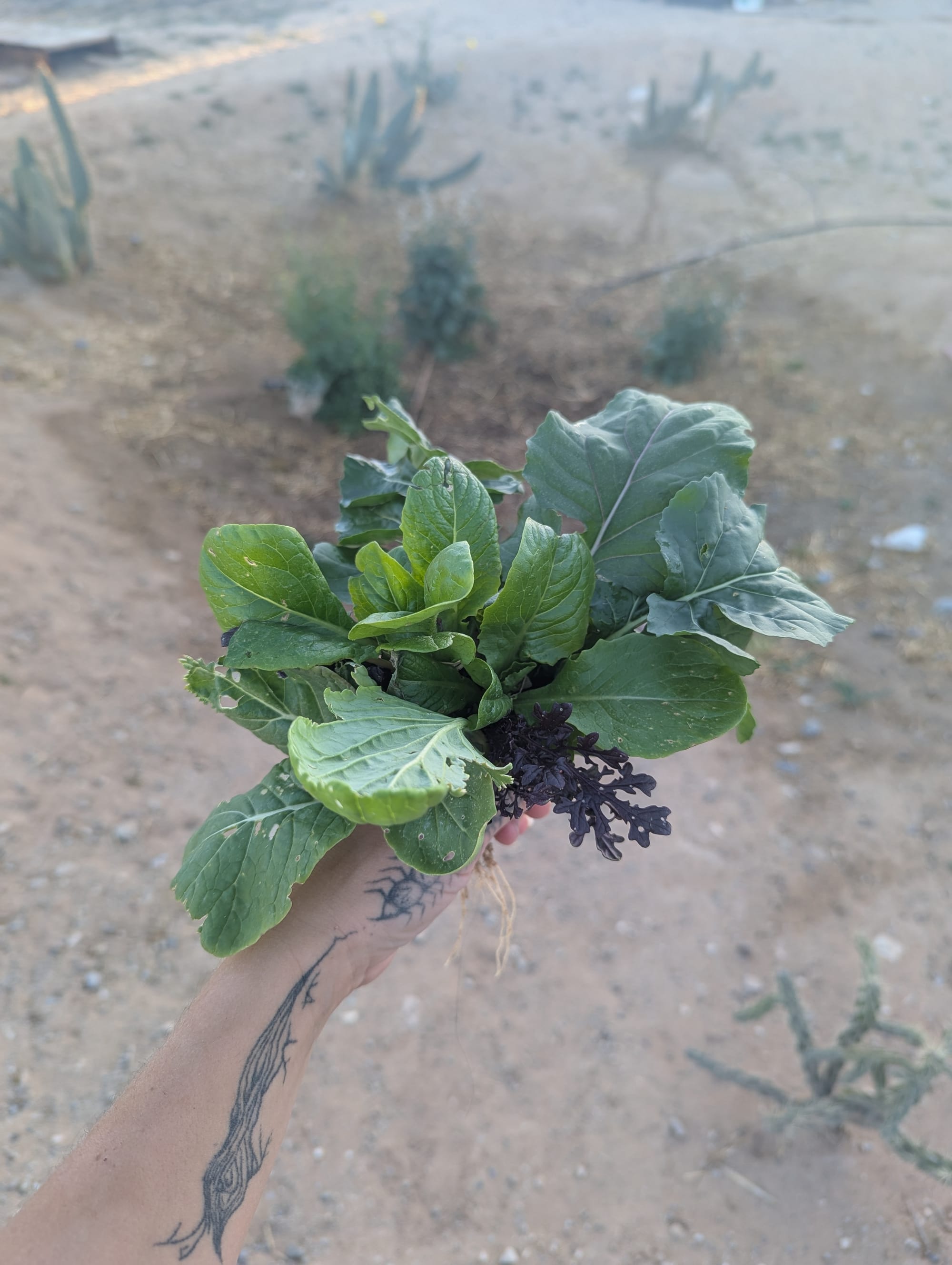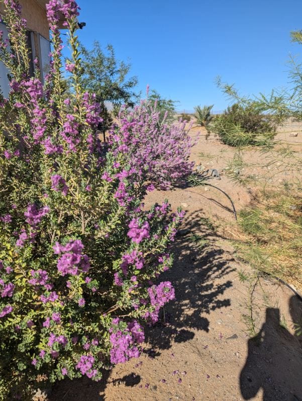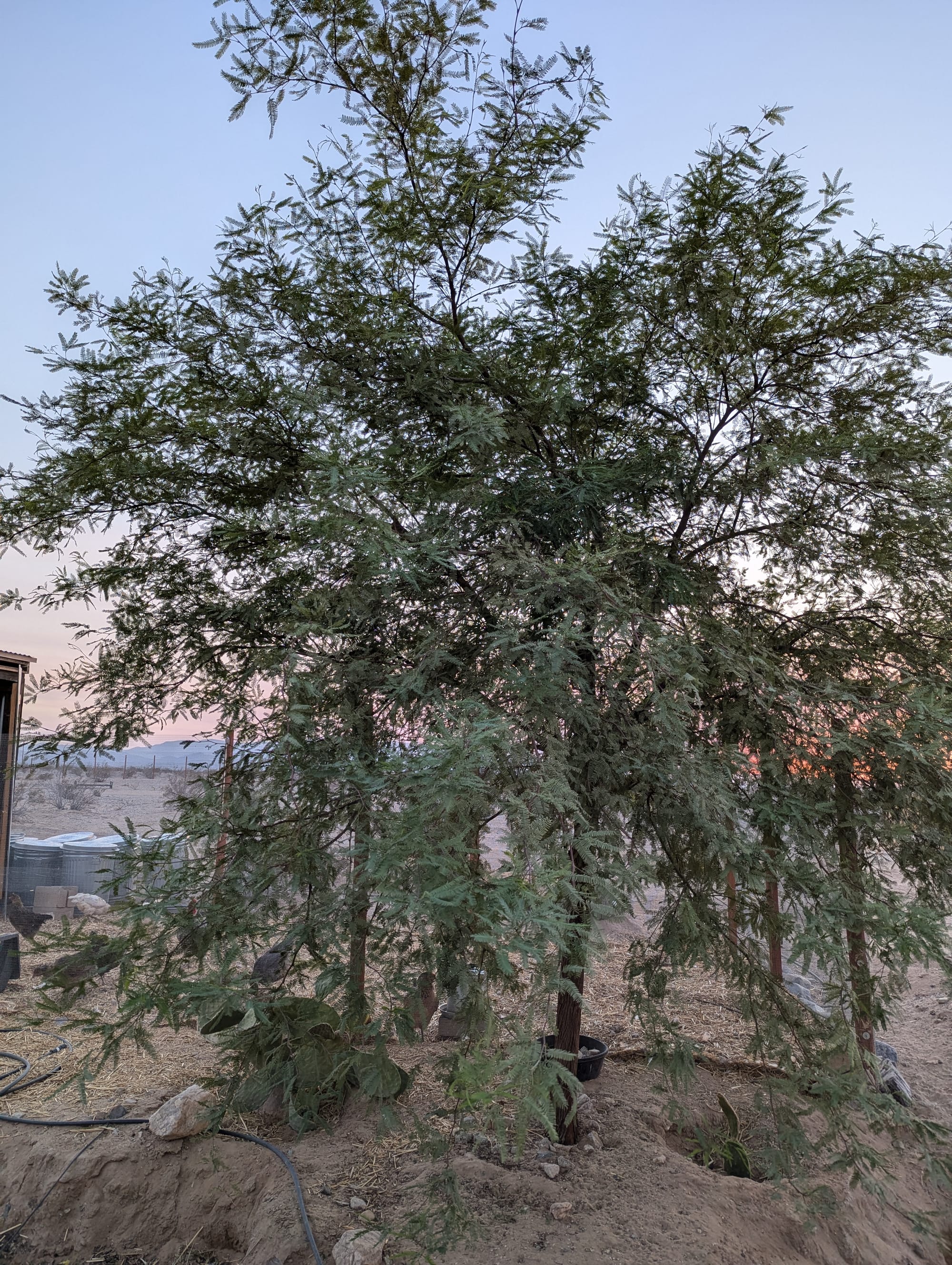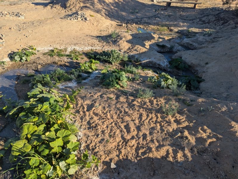 Thinning greens from garden beds in late February 2026, this little boquet of baby greens is salad-ready (after a little rinse)Sunchoke babe February 2026Blooming flax by baby honey mesquite in our new East garden February 2026Heavy rains back in October 2023, photos taken to track water movement and plan earthworksBack in 2023 we took organic waste from local festival Bhakti Fest to aid in sustainable waste management for our community. Here is Starlight pulling trash from unscrupulous festival goers out of the compost material. Blooms in front of the house Fall 2025Greywater basin evolution as of January 2026 with more mature volunteer plants and a deeper channel to permit upward water filtration. A charcoal biofilter has been added before the dropoff with filter plants being grown. Pigs that we also brought home from the homestead that needed to get rid of its stock. They also seem quite pleased with larger, cleaner living quarters (and lots more food!)Turkeys we brought home from a failing homestead. They were in very neglectful conditions but are recovering and seem much more relaxed - they will be food for our working dog in the Spring. One yearling "mama" and her three toms, there is also a young female not pictured. Baby squash on the vine with their blossomsUpdated greywater basin with meandering channels as of December 2025. Winter wheat is sprouting at the far end, and the closer side is getting very green!More and more raptors are returning. This is a coopers hawk scouting the chicken run (he can't get in, don't worry, but that doesn't stop him from taking a peek every now and then). Newly completed (as of November 2025) earthworks amongst in-progress earthworks in our front herb and vegetable garden. We just transplanted this 9 month old Chilean mesquite so it could have a drier home, and the palo verdes behind it have been there for about a year now.Desert milkweed in front of a greywater basin with meandering channels in progress, full of flourishing native and non-native annuals like desert sunflower, cinchweed, spaghetti squash (for future pigs), ricegrass, and others. Some seeds were planted, some washed in during heavy rains and are wild natives. Mixed cover crop, medicinal, and vegetable basinOso protecting his flock this SummerHard to tell in the light, but this egg is purple, courtesy of one of our beloved hensMushrooms fruiting after rain (unknown type)Cowpeas are the champions of the Fall season so farCaesar and Nero (rear) the roosters, all grown upMultiple types of scarab beetles have returnedFlowering velvet mesquite with native bees (not honeybees!) and mothsCarving meandering channels for greywater management, yellow clover for soil cover and restorationSprouting squash in new soil we've built up using some unconventional methodsBlooming Texas Sage, a "non" sage with medicinal propertiesEarthworks in progress near the main house and a gorgeous two year old Chilean mesquite near the chicken runEarthworks in progress and new Chilean mesquite trees. Also shown: prickly pear cacti, an established acacia tree, and freshly planted jojoba in the back right.A tiger wing butterfly on blooming upright rosemaryEggs from our first flock of chickensA rare foggy dayBrooding Naked Neck chicks (about 2 weeks old) in a straw bale enclosure within the chicken coopOur first Chilean mesquite at 2.5 years oldOur first flock of chickens consisting of several different breeds, preparing to come off roost to eatLoyal guardian dog, Diego, taking a rest in the sunshineEmerging stars over the West fenceOur first potato cropLizards are returning to our landbaseA young cockerel (baby rooster)Place-sensible chickens with their long naked necks - this flock will thrive even through our hot summersViolet sage blooming in an infiltration basinStarlight & SiinWhite sage (forward) and screwbean mesquite (rear)Rhode Island Red chicks (our livestock cleanup team) at home in the eggmobileGolden hour in the baby West side forestGolden hour in the baby west side forestThe eggmobile, ready to be moved to livestock yards come FallProvider green beans sproutingBlack walnut and flowering green onions in a greywater basin - veggies in this basin are for genetic selection only (not eating), we'll save their seeds and replant elsewhere.