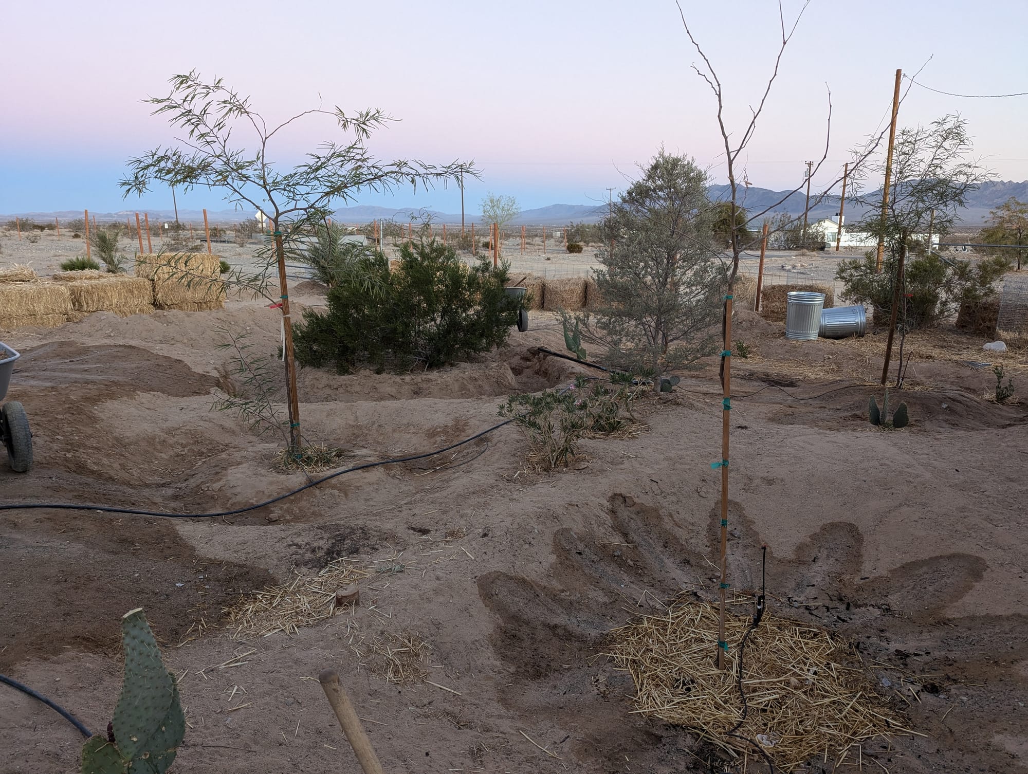 An updated photo of the West side trees and basins as of December 2025. These trees were planted October - December of 2024 from 5 gallon nursery saplings. They are now established and the drip lines, yet to be removed, are not actually on.